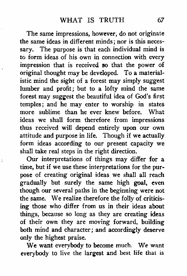 The same impressions, however, do not originate the same ideas in different minds; nor is this necessary. The purpose is that each individual mind is to form ideas of his own in connection with every impression that is received so that the power of original thought may be developed. To a materialistic mind the sight of a forest may simply suggest lumber and profit; but to a lofty mind the same forest may suggest the beautiful idea of God's first temples; and he may enter to worship in states more sublime than he ever knew before. What ideas we shall form therefore from impressions thus received will depend entirely upon our own attitude and purpose in life. Though if we actually form ideas according to our present capacity we shall take real steps in the right direction.
