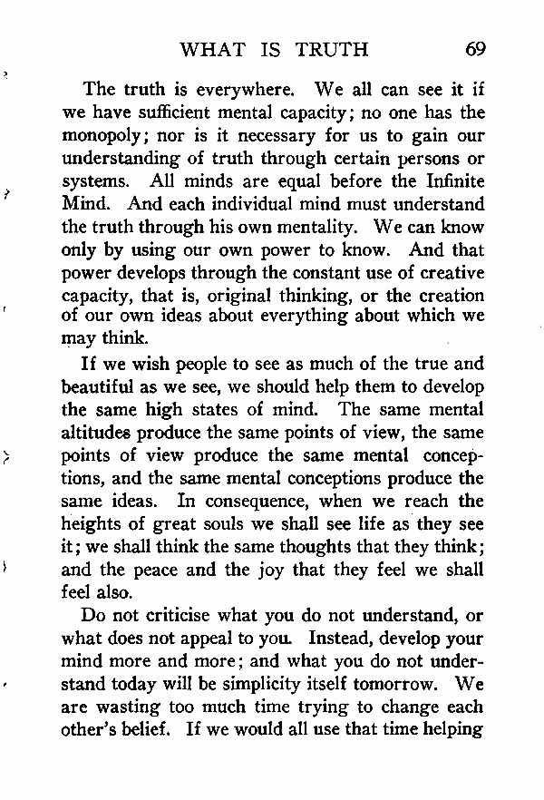 The truth is everywhere. We all can see it if we have sufficient mental capacity; no one has the monopoly; nor is it necessary for us to gain our understanding of truth through certain persons or systems. All minds are equal before the Infinite Mind. And each individual mind must understand the truth through his own mentality. We can know only by using our own power to know. And that power develops through the constant use of creative capacity, that is, original thinking, or the creation of our own ideas about everything about which we may think.