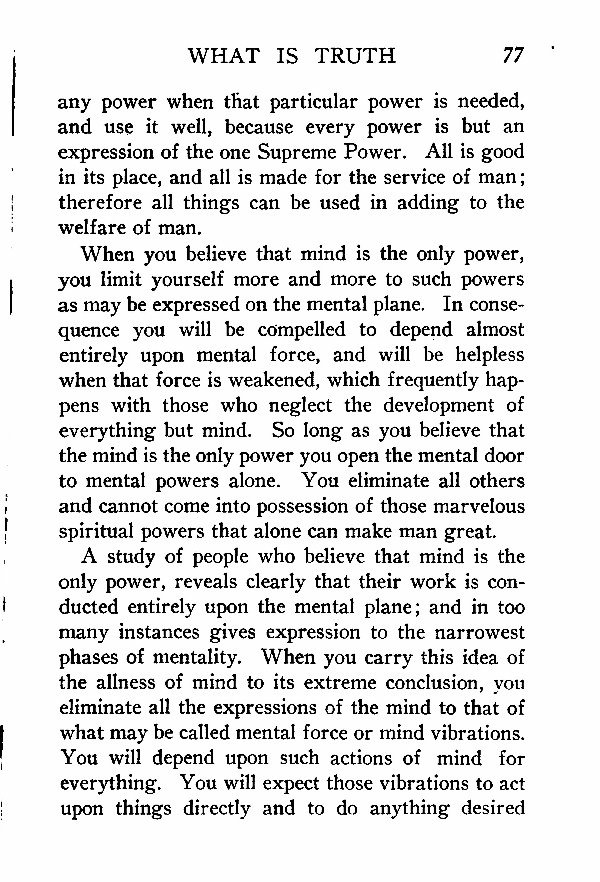 A study of people who believe that mind is the only power, reveals clearly that their work is conducted entirely upon the mental plane; and in too many instances gives expression to the narrowest phases of mentality. When you carry this idea of the allness of mind to its extreme conclusion, you eliminate all the expressions of the mind to that of what may be called mental force or mind vibrations. You will depend upon such actions of mind for everything. You will expect those vibrations to act upon things directly and to do anything desired