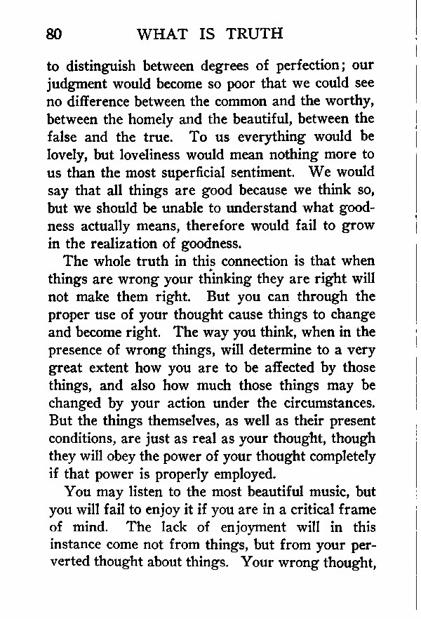 The whole truth in this connection is that when things are wrong your thinking they are right will not make them right. But you can through the proper use of your thought cause things to change and become right. The way you think, when in the presence of wrong things, will determine to a very great extent how you are to be affected by those things, and also how much those things may be changed by your action under the circumstances. But the things themselves, as well as their present conditions, are just as real as your thought, though they will obey the power of your thought completely if that power is properly employed.