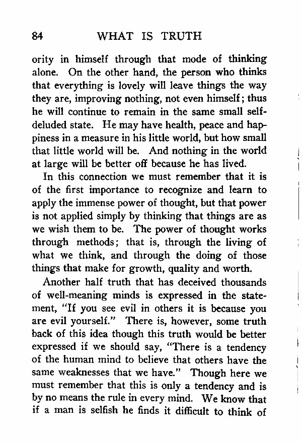 Another half truth that has deceived thousands of well-meaning minds is expressed in the statement, "If you see evil in others it is because you are evil yourself." There is, however, some truth back of this idea though this truth would be better expressed if we should say, "There is a tendency of the human mind to believe that others have the same weaknesses that we have." Though here we must remember that this is only a tendency and is by no means the rule in every mind. We know that if a man is selfish he finds it difficult to think of