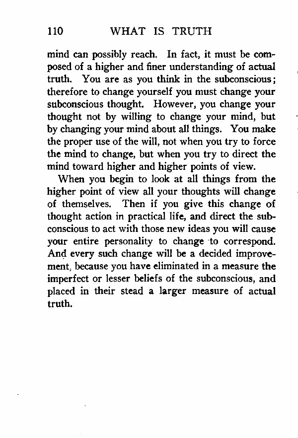 mind can possibly reach. In fact, it must be composed of a higher and finer understanding of actual truth. You are as you think in the subconscious; therefore to change yourself you must change your subconscious thought. However, you change your thought not by willing to change your mind, but by changing your mind about all things. You make the proper use of the will, not when you try to force the mind to change, but when you try to direct the mind toward higher and higher points of view.