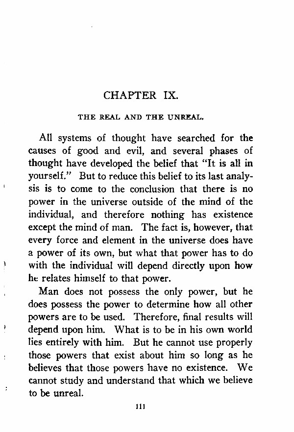 All systems of thought have searched for the causes of good and evil, and several phases of thought have developed the belief that "It is all in yourself/' But to reduce this belief to its last analysis is to come to the conclusion that there is no power in the universe outside of the mind of the individual, and therefore nothing has existence except the mind of man. The fact is, however, that every force and element in the universe does have a power of its own, but what that power has to do with the individual will depend directly upon how he relates himself to that power.
