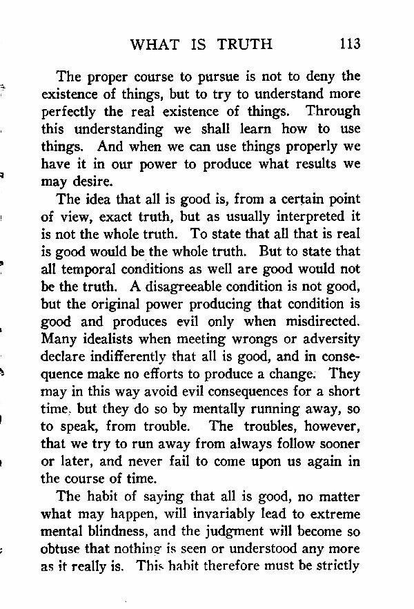 The idea that all is good is, from a certain point of view, exact truth, but as usually interpreted it is not the whole truth. To state that all that is real is good would be the whole truth. But to state that all temporal conditions as well are good would not be the truth. A disagreeable condition is not good, but the original power producing that condition is good and produces evil only when misdirected. Many idealists when meeting wrongs or adversity declare indifferently that all is good, and in consequence make no efforts to produce a change. They may in this way avoid evil consequences for a short time, but they do so by mentally running away, so to speak, from trouble. The troubles, however, that we try to run away from always follow sooner or later, and never fail to come upon us again in the course of time.