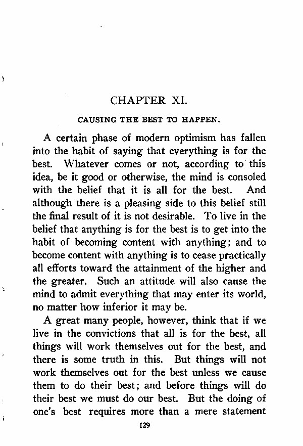 A certain phase of modern optimism has fallen into the habit of saying that everything is for the best. Whatever comes or not, according to this idea, be it good or otherwise, the mind is consoled with the belief that it is all for the best. And although there is a pleasing side to this belief still the final result of it is not desirable. To live in the belief that anything is for the best is to get into the habit of becoming content with anything; and to become content with anything is to cease practically all efforts toward the attainment of the higher and the greater. Such an attitude will also cause the mind to admit everything that may enter its world, no matter how inferior it may be.