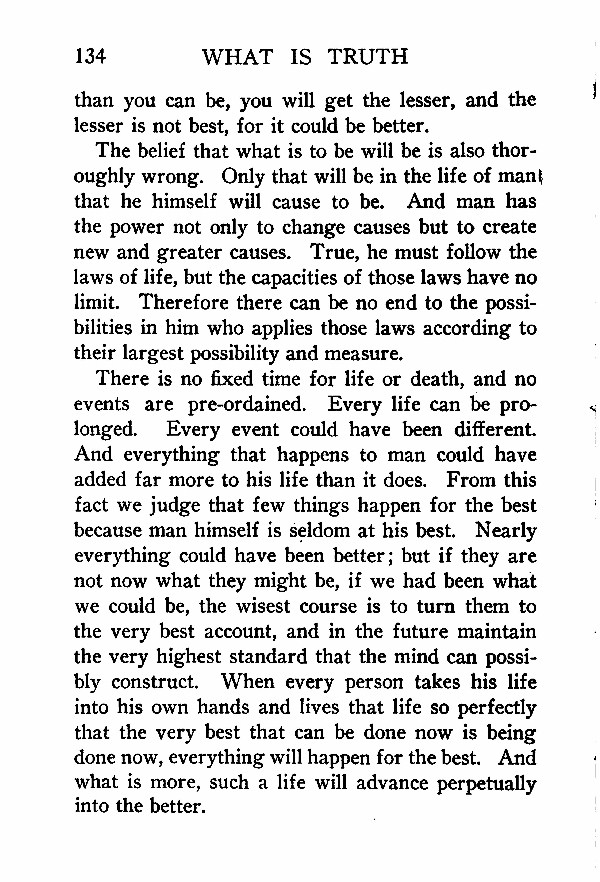 The belief that what is to be will be is also thoroughly wrong. Only that will be in the life of man that he himself will cause to be. And man has the power not only to change causes but to create new and greater causes. True, he must follow the laws of life, but the capacities of those laws have no limit. Therefore there can be no end to the possibilities in him who applies those laws according to their largest possibility and measure.