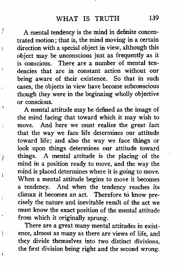 A mental attitude may be defined as the image of the mind facing that toward which it may wish to move. And here we must realize the great fact that the way we face life determines our attitude toward life; and also the way we face things or look upon things determines our attitude toward things. A mental attitude is the placing of the mind in a position ready to move, and the way the mind is placed determines where it is going to move. When a mental attitude begins to move it becomes a tendency. And when the tendency reaches its climax it becomes an act. Therefore to know precisely the nature and inevitable result of the act we must know the exact position of the mental attitude from which it originally sprung.