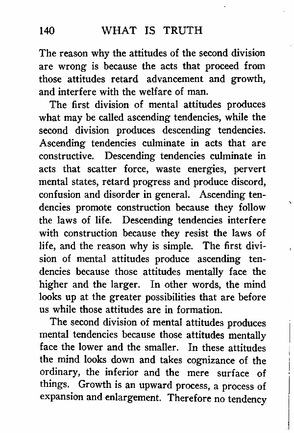 The first division of mental attitudes produces what may be called ascending tendencies, while the second division produces descending tendencies. Ascending tendencies culminate in acts that are constructive. Descending tendencies culminate in acts that scatter force, waste energies, pervert mental states, retard progress and produce discord, confusion and disorder in general. Ascending tendencies promote construction because they follow the laws of life. Descending tendencies interfere with construction because they resist the laws of life, and the reason why is simple. The first division of mental attitudes produce ascending tendencies because those attitudes mentally face the higher and the larger. In other words, the mind looks up at the greater possibilities that are before us while those attitudes are in formation.