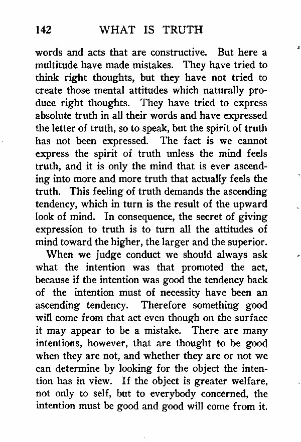 words and acts that are constructive. But here a multitude have made mistakes. They have tried to think right thoughts, but they have not tried to create those mental attitudes which naturally produce right thoughts. They have tried to express absolute truth in all their words and have expressed the letter of truth, so to speak, but the spirit of truth has not been expressed. The fact is we cannot express the spirit of truth unless the mind feels truth, and it is only the mind that is ever ascending into more and more truth that actually feels the truth. This feeling of truth demands the ascending tendency, which in turn is the result of the upward look of mind. In consequence, the secret of giving expression to truth is to turn all the attitudes of mind toward the higher, the larger and the superior. When we judge conduct we should always ask what the intention was that promoted the act, because if the intention was good the tendency back of the intention must of necessity have been an ascending tendency. Therefore something good will come from that act even though on the surface it may appear to be a mistake. There are many intentions, however, that are thought to be good when they are not, and whether they are or not we can determine by looking for the object the intention has in view. If the object is greater welfare, not only to self, but to everybody concerned, the intention must be good and good will come from it.
