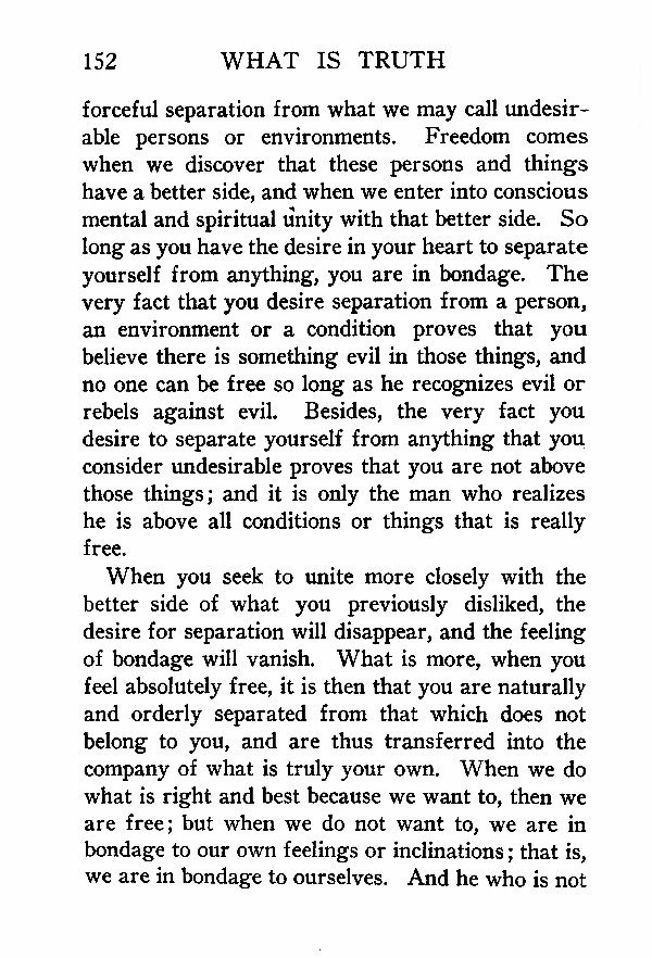forceful separation from what we may call undesirable persons or environments. Freedom comes when we discover that these persons and things have a better side, and when we enter into conscious mental and spiritual unity with that better side. So long as you have the desire in your heart to separate yourself from anything, you are in bondage. The very fact that you desire separation from a person, an environment or a condition proves that you believe there is something evil in those things, and no one can be free so long as he recognizes evil or rebels against evil. Besides, the very fact you desire to separate yourself from anything that you consider undesirable proves that you are not above those things; and it is only the man who realizes he is above all conditions or things that is really free.