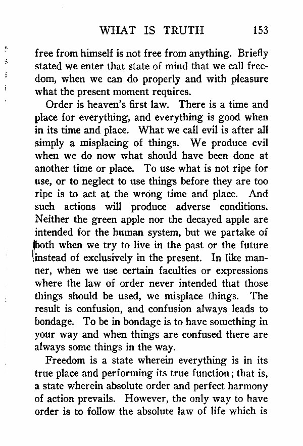 Order is heaven's first law. There is a time and place for everything, and everything is good when in its time and place. What we call evil is after all simply a misplacing of things. We produce evil when we do now what should have been done at another time or place. To use what is not ripe for use, or to neglect to use things before they are too ripe is to act at the wrong time and place. And such actions will produce adverse conditions. Neither the green apple nor the decayed apple are intended for the human system, but we partake of both when we try to live in the past or the future i instead of exclusively in the present. In like manner, when we use certain faculties or expressions where the law of order never intended that those things should be used, we misplace things. The result is confusion, and confusion always leads to bondage. To be in bondage is to have something in your way and when things are confused there are always some things in the way.