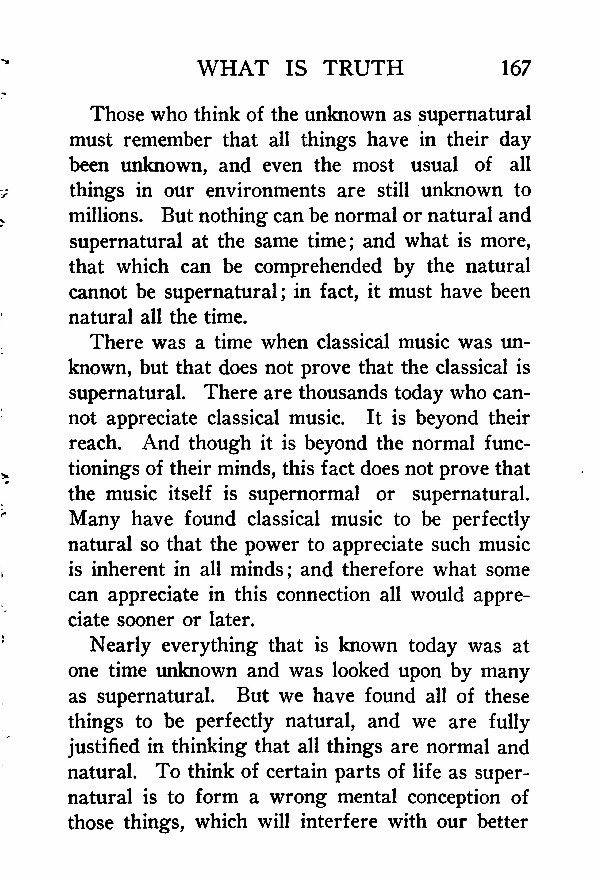 There was a time when classical music was unknown, but that does not prove that the classical is supernatural. There are thousands today who cannot appreciate classical music. It is beyond their reach. And though it is beyond the normal functionings of their minds, this fact does not prove that the music itself is supernormal or supernatural. Many have found classical music to be perfectly natural so that the power to appreciate such music is inherent in all minds; and therefore what some can appreciate in this connection all would appreciate sooner or later.