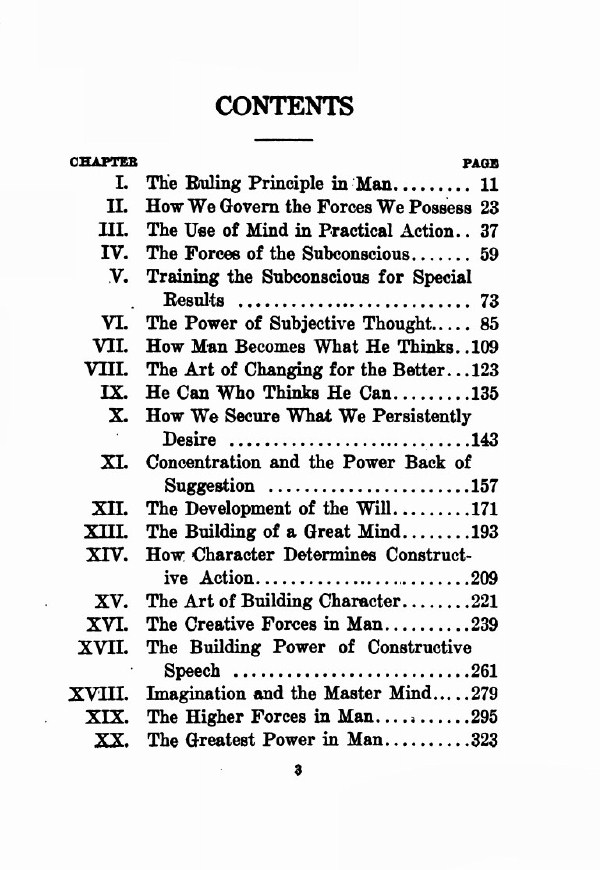 Contents - Foreword - Ruling Principle of Man - How We Govern The Forces We Possess - Use of Mind In Practical Action - Forces of The Subconscious - Training the Subconscious for Practical Results - Power of Subjective Thought - How Man Becomes What He Thinks - Art of Changing For The Better - He Can Who Thinks He Can - How We Secure What We Persistently Desire - Concentration And The Power Back of the Suggestion - Development of the Will - Building of a Great Mind - How Character Determines Constructive Action - Art of Building Character - Creative Forces in Man - Building Power of Constructive Speech - Imagination and the Master Mind - Higher Forces in Man - Greatest Power in Man -