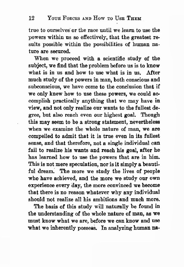 When we proceed with a scientific study of the subject, we find that the problem before us is to know what is in us and how to use what is in us. After much study of the powers in man, both conscious and subconscious, we have come to the conclusion that if we only knew how to use these powers, we could accomplish practically anything that we may have in view, and not only realize our wants to the fullest degree, but also reach even our highest goal. Though this may seem to be a strong statement, nevertheless when we examine the whole nature of man, we are compelled to admit that it is true even in its fullest sense, and that therefore, not a single individual can fail to realize his wants and reach his goal, after he has learned how to use the powers that are in him.