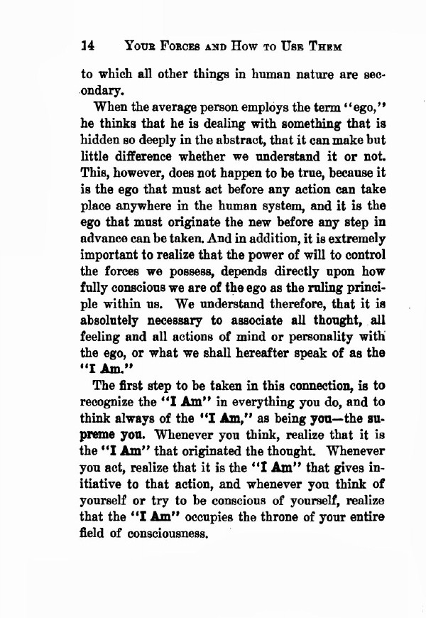 We understand therefore, that it is absolutely necessary to associate all thought, all, feeling and all actions of mind or personality with the ego, or what we shall hereafter speak of as the "I Am" The first step to be taken in this connection, is to recognize the "I Am" in everything you do, and to think always of the "I Am," as being you -- the supreme you. Whenever you think, realize that it is the "I Am" that originated the thought. Whenever you act, realize that it is the "I Am" that gives initiative to that action, and whenever you think of yourself or try to be conscious of yourself, realize that the "I Am" occupies the throne of your entire field of consciousness.