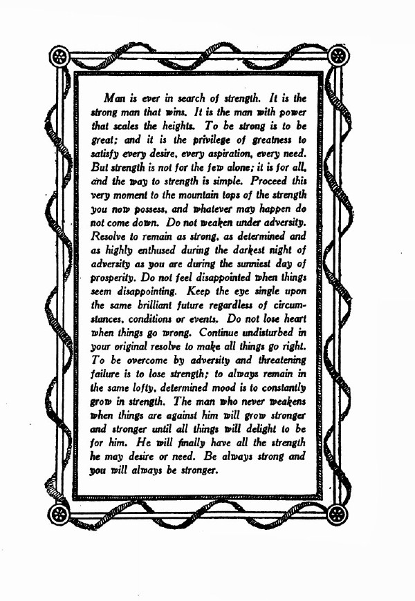 Man is ever in search of strength. It is the strong man that wins. It is the man with power that scales the heights. To be strong is to be great; and it is the privilege of greatness to satisfy every desire, every aspiration, every need. But strength is not for the few alone; it is for all, and the way to strength is simple.