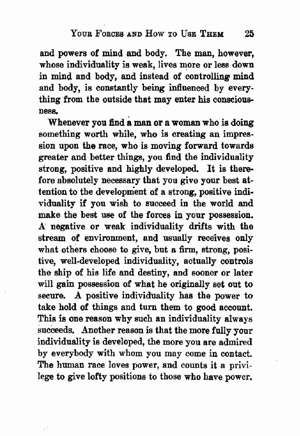 Whenever you find a man or a woman who is doing something worthwhile, who is creating an impression upon the race, who is moving forward towards greater and better things, you find the individuality strong, positive and highly developed. It is therefore absolutely necessary that you give your best attention to the development of a strong, positive individuality if you wish to succeed in the world and make the best use of the forces in your possession. A negative or weak individuality drifts with the stream of environment, and usually receives only what others choose to give, but a firm, strong, positive, well-developed individuality, actually controls the ship of their life and destiny, and sooner or later will gain possession of what they originally set out to secure. A positive individuality has the power to take hold of things and turn them to good account. This is one reason why such an individuality always succeeds. Another reason is that the more fully your individuality is developed, the more you are admired by everybody with whom you may come in contact. The human race loves power, and counts it a privilege to give lofty positions to those who have power,