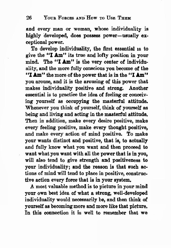 To develop individuality, the first essential is to give the "I Am" its true and lofty position in your mind. The "I Am" is the very centre of individuality, and the more fully conscious you become of the "I Am" the more of the power that is in the "I Am" you arouse, and it is the arousing of this power that makes individuality positive and strong. Another essential is to practise the idea of feeling or conceiving yourself as occupying the masterful attitude. Whenever you think of yourself, think of yourself as being and living and acting in the masterful attitude. Then in addition, make every desire positive, make every feeling positive, make every thought positive, and make every action of mind positive. To make your wants distinct and positive, that is, to actually and fully know what you want and then proceed to want what you want with all the power that is in you, will also tend to give strength and positiveness to your individuality; and the reason is that such actions of mind will tend to place in positive, constructive action every force that is in your system.