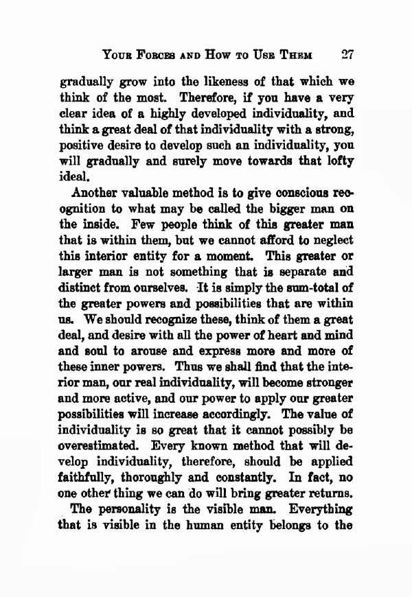 gradually grow into the likeness of that which we think of the most. Therefore, if you have a very clear idea of a highly developed individuality, and think a great deal of that individuality with a strong, positive desire to develop such an individuality, you will gradually and surely move towards that lofty ideal. Another valuable method is to give conscious recognition to what may be called the bigger man on the inside. Few people think of this greater man that is within them, but we cannot afford to neglect this interior entity for a moment. This greater or larger man is not something that is separate and distinct from ourselves. It is simply the sum-total of the greater powers and possibilities that are within us. We should recognize these, think of them a great deal, and desire with all the power of heart and mind and soul to arouse and express more and more of these inner powers.