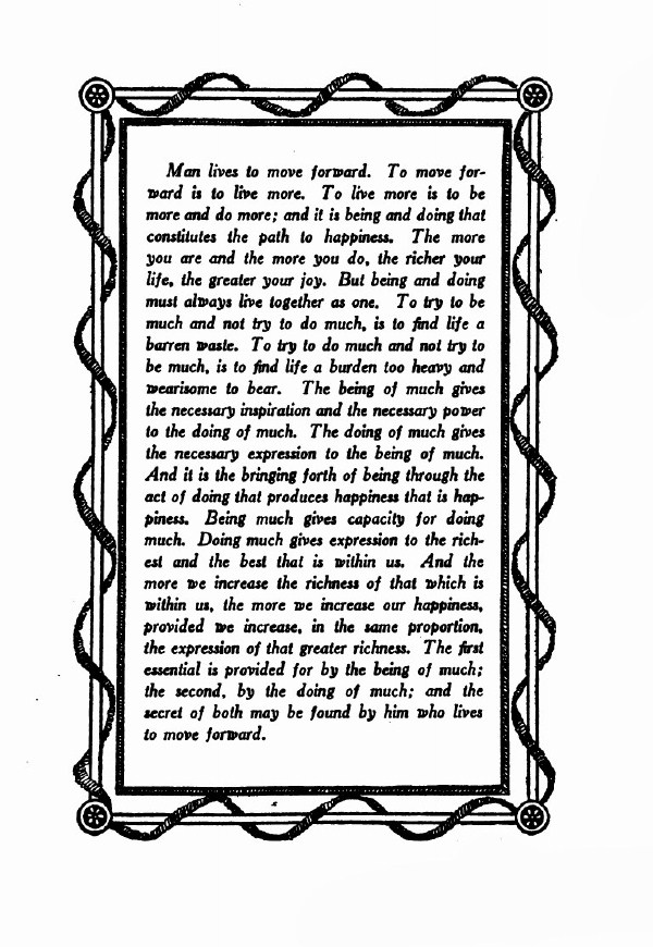 The first essential is provided for by the being of much; the second, by the doing of much; and the secret of both may be found by him who lives to move forward.