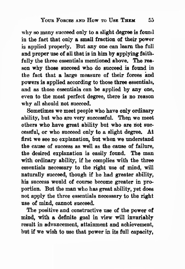 why so many succeed only to a slight degree is found in the fact that only a small fraction of their power is applied properly. But anyone can learn the full and proper use of all that is in them by applying faithfully the three essentials mentioned above. The reason why those succeed who do succeed is found in the fact that a large measure of their forces and powers is applied according to those three essentials, and as those essentials can be applied by anyone, even to the most perfect degree, there is no reason why all should not succeed.