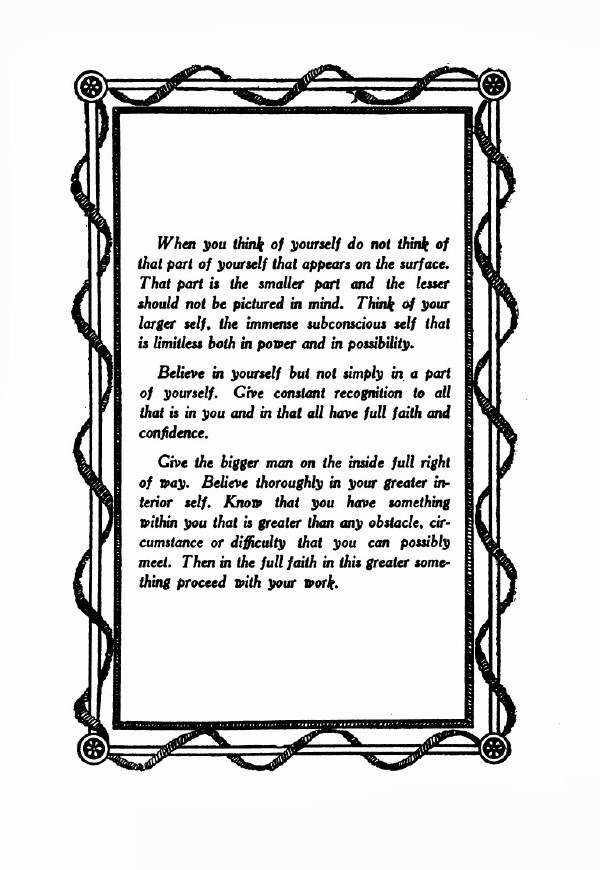 When you think of yourself do not think of that part of yourself that appears on the surface. That part is the smaller part and the lesser should not be pictured in mind. Think of your larger self, the immense subconscious self that is limitless both in power and in possibility.