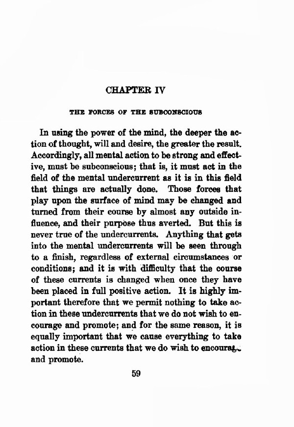 In using the power of the mind, the deeper the action of thought, will and desire, the greater the result. Accordingly, all mental action to be strong and effective, must be subconscious; that is, it must act in the field of the mental undercurrent as it is in this field that things are actually done. Those forces that play upon the surface of mind may be changed and turned from their course by almost any outside influence, and their purpose thus averted. But this is never true of the undercurrents. Anything that gets into the mental undercurrents will be seen through to a finish, regardless of external circumstances or conditions; and it is with difficulty that the course of these currents is changed when once they have been placed in full positive action.