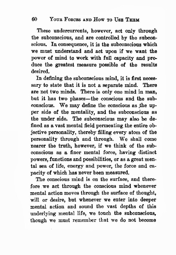 These undercurrents, however, act only through the subconscious, and are controlled by the subconscious. In consequence, it is the subconscious which we must understand and act upon if we want the power of mind to work with full capacity and produce the greatest measure possible of the results desired.