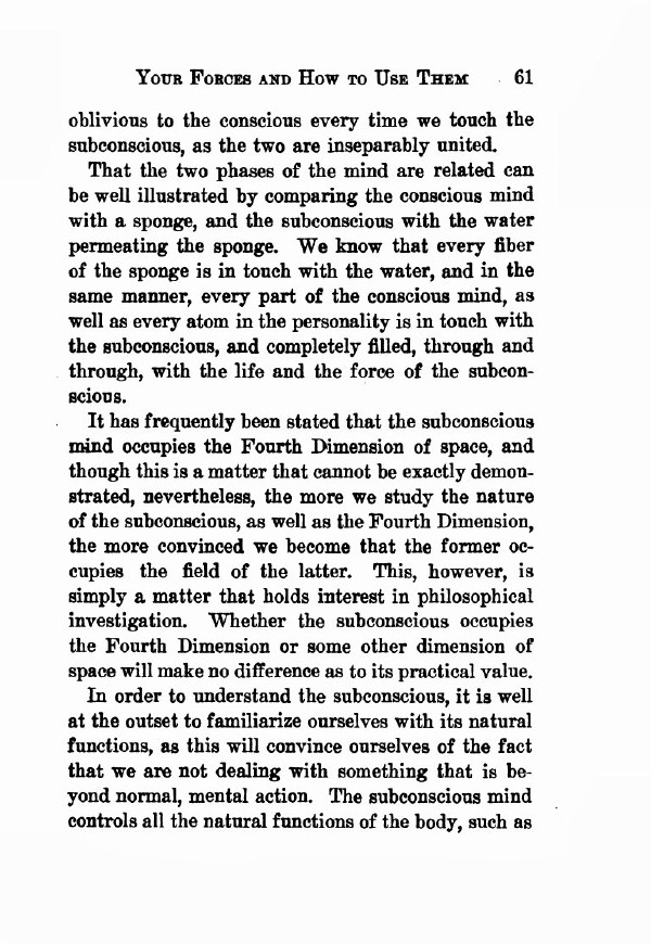 It has frequently been stated that the subconscious mind occupies the Fourth. Dimension of space, and though this is a matter that cannot be exactly demonstrated, nevertheless, the more we study the nature of the subconscious, as well as the Fourth Dimension, the more convinced we become that the former occupies the field of the latter. This, however, is simply a matter that holds interest in philosophical investigation. Whether the subconscious occupies the Fourth Dimension or some other dimension of space will make no difference as to its practical value.