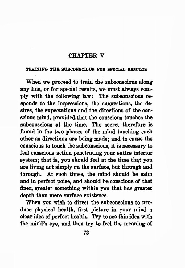 When we proceed to train the subconscious along any line, or for special results, we must always comply with the following law: The subconscious responds to the impressions, the suggestions, the desires, the expectations and the directions of the conscious mind, provided that the conscious touches the subconscious at the time. The secret therefore is found in the two phases of the mind touching each other as directions are being made; and to cause the conscious to touch the subconscious, it is necessary to feel conscious action penetrating your entire interior system; that is, you should feel at the time that you are living not simply on the surface, but through and through. At such times, the mind should be calm and in perfect poise, and should be conscious of that finer, greater something within you that has greater depth than mere surface existence.