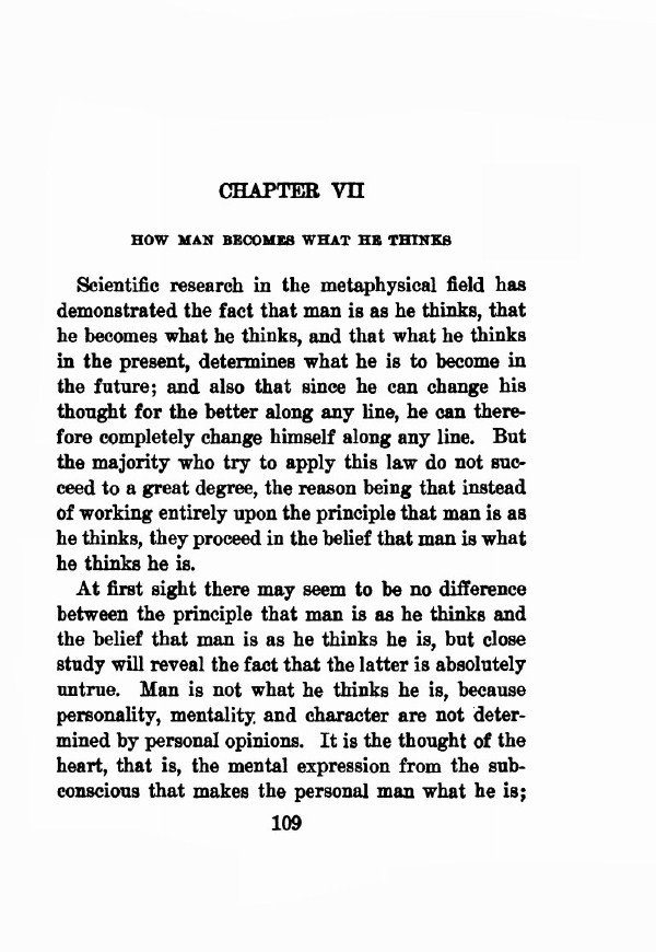 Scientific research in the metaphysical field has demonstrated the fact that man is as he thinks, that he becomes what he thinks, and that what he thinks in the present, determines what he is to become in the future; and also that since he can change his thought for the better along any line, he can therefore completely change himself along any line. But the majority who try to apply this law do not succeed to a great degree, the reason being that instead of working entirely upon the principle that man is as he thinks, they proceed in the belief that man is what he thinks he is.