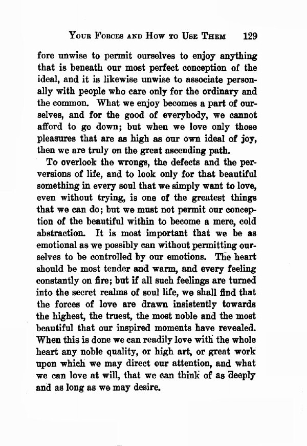 To overlook the wrongs, the defects and the perversions of life, and to look only for that beautiful something in every soul that we simply want to love, even without trying, is one of the greatest things that we can do; but we must not permit our conception of the beautiful within to become a mere, cold abstraction. It is most important that we be as emotional as we possibly can without permitting ourselves to be controlled by our emotions. The heart should be most tender and warm, and every feeling constantly on fire; but if all such feelings are turned into the secret realms of soul life, we shall find that the forces of love are drawn insistently towards the highest, the truest, and most noble and the most beautiful that our inspired moments have revealed. When this is done we can readily love with the whole heart any noble quality, or high art, or great work upon which we may direct our attention, and what we can love at will, that we can think of as deeply and as long as we may desire.