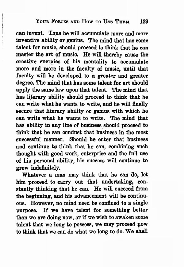 can invent. Thus he will accumulate more and more inventive ability or genius. The mind that has some talent for music, should proceed to think that they can master the art of music. They will thereby cause the creative energies of their mentality to accumulate more and more in the faculty of music, until that faculty will be developed to a greater and greater degree. The mind that has some talent for art should apply the same law upon that talent. The mind that has literary ability should proceed to think that they can write what they want to write, and they will finally secure that literary ability or genius with which they can write what they want to write. The mind that has ability in any line of business should proceed to think that they can conduct that business in the most successful manner. Should they enter that business and continue to think that they can, combining such thought with good work, enterprise and the full use of their personal ability, their success will continue to grow indefinitely.