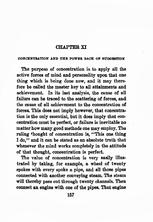 The purpose of concentration is to apply all the active forces of mind and personality upon that one thing which is being done now, and it may therefore be called the master key to all attainments and achievement. In its last analysis, the cause of all failure can be traced to the scattering of forces, and the cause of all achievement to the concentration of forces. This does not imply however, that concentration is the only essential, but it does imply that concentration must be perfect, or failure is inevitable no matter how many good methods one may employ. The ruling thought of concentration is, " This one thing I do," and it can be stated as an absolute truth that whenever the mind works completely in the attitude of that thought, concentration is perfect.
