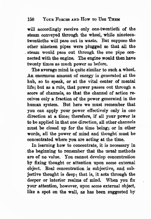 The average mind is quite similar to such a wheel. An enormous amount of energy is generated at the hub, so to speak, or at the vital centre of mental life; but as a rule, that power passes out through a score of channels, so that the channel of action receives only a fraction of the power generated in the human system. But here we must remember that you can apply your power effectively only in one direction at a time; therefore, if all your power is to be applied in that one direction, all other channels must be closed up for the time being; or in other words, all the power of mind and thought must be concentrated where you are acting at the time.