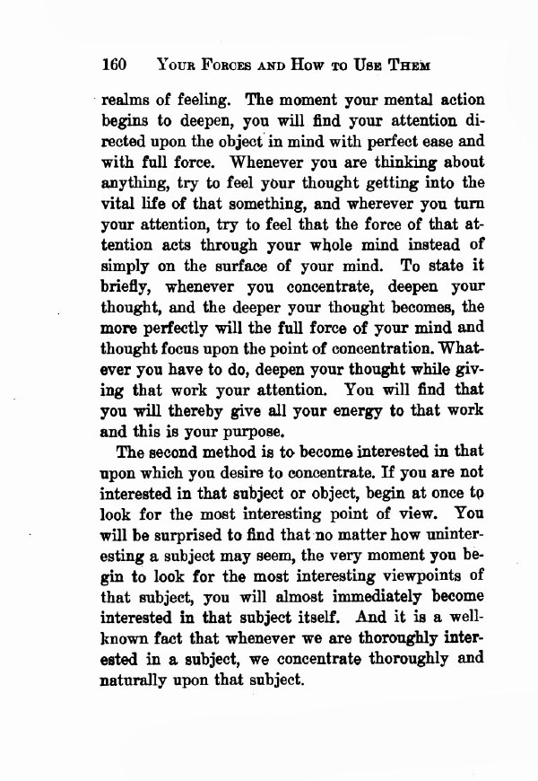 Whenever you are thinking about anything, try to feel your thought getting into the vital life of that something, and wherever you turn your attention, try to feel that the force of that attention acts through your whole mind instead of simply on the surface of your mind. To state it briefly, whenever you concentrate, deepen your thought, and the deeper your thought becomes, the more perfectly will the full force of your mind and thought focus upon the point of concentration. Whatever you have to do, deepen your thought while giving that work your attention, You will find that you will thereby give all your energy to that work and this is your purpose.