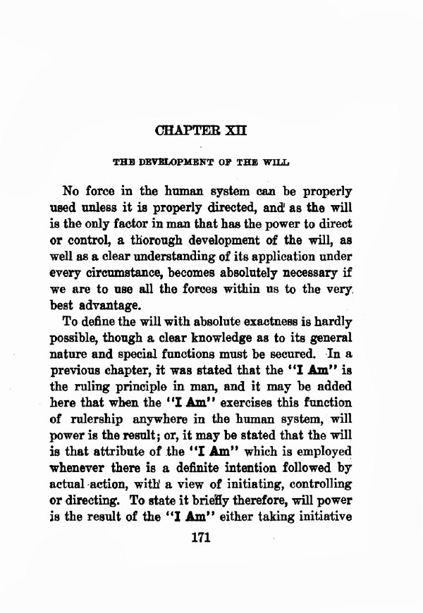 To define the will with absolute exactness is hardly possible, though a clear knowledge as to its general nature and special functions must be secured. In a previous chapter, it was stated that the "I Am" is the ruling principle in man, and it may be added here that when the "I Am" exercises this function of rulership anywhere in the human system, will power is the result; or, it may be stated that the will is that attribute of the "I Am" which is employed whenever there is a definite intention followed by actual action, with a view of initiating, controlling or directing. To state it briefly therefore, will power is the result of the "I Am" either taking initiative