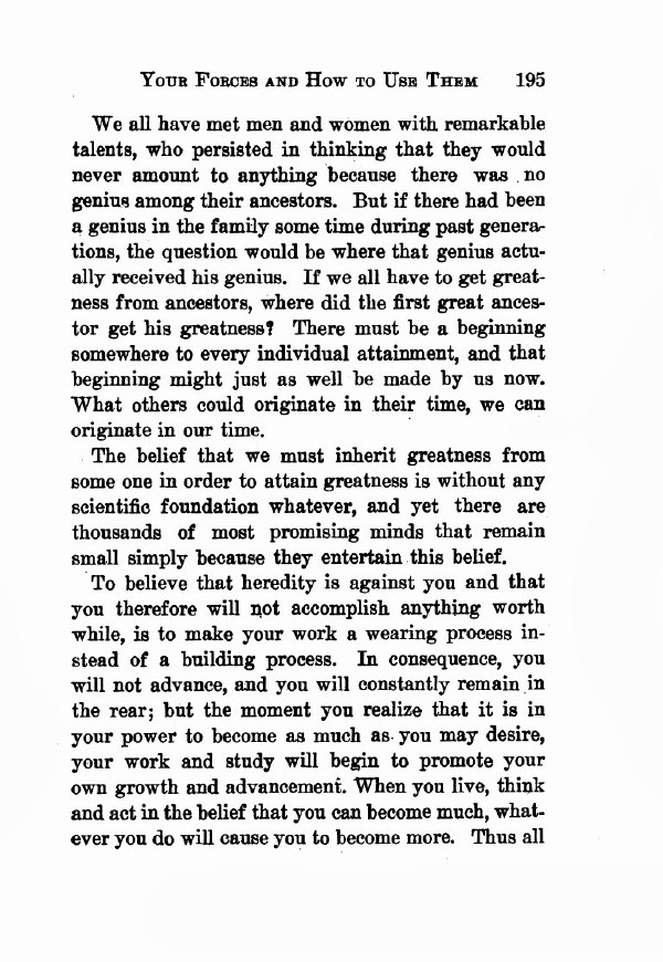 We all have met men and women with remarkable talents who persisted in thinking that they would never amount to anything because there was no genius among their ancestors. But if there had been a genius in the family some time during past generations, the question would be where that genius actually received their genius. If we all have to get greatness from ancestors, where did the first great ancestor get their greatness? There must be a beginning somewhere to every individual attainment, and that beginning might just as well be made by us now. What others could originate in their time, we can originate in our time.