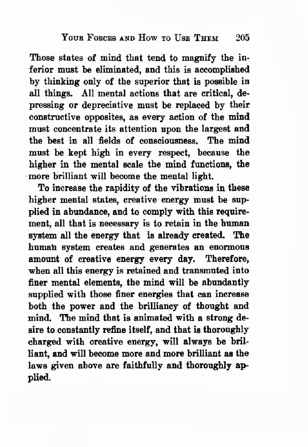 To increase the rapidity of the vibrations in these higher mental states, creative energy must be supplied in abundance, and to comply with this requirement, all that is necessary is to retain in the human system all the energy that is already created. The human system creates and generates an enormous amount of creative energy every day. Therefore, when all this energy is retained and transmuted into finer mental elements, the mind will be abundantly supplied with those finer energies that can increase both the power and the brilliancy of thought and mind. The mind that is animated with a strong desire to constantly refine itself, and that is thoroughly charged with creative energy, will always be brilliant, and will become more and more brilliant as the laws given above are faithfully and thoroughly applied.