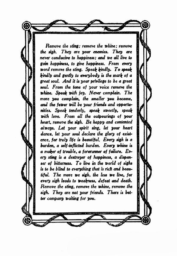 Remove the sting; remove the whine; remove the sigh. They are your enemies. They are never conducive to happiness; and we all live to gain happiness, to give happiness.