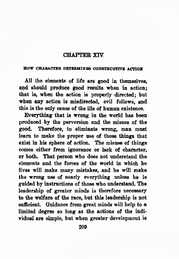 Everything that is wrong in the world has been produced by the perversion and the misuse of the good. Therefore, to eliminate wrong, man must learn to make the proper use of those things that exist in his sphere of action. The misuse of things comes either from ignorance or lack of character, or both. That person who does not understand the elements and the forces of the world in which they live will make many mistakes, and will make the wrong use of nearly everything unless they are guided by instructions of those who understand. The leadership of greater minds is therefore necessary to the welfare of the race, but this leadership is not sufficient. Guidance from great minds will help to a limited degree so long as the actions of the individual are simple, but when greater development is