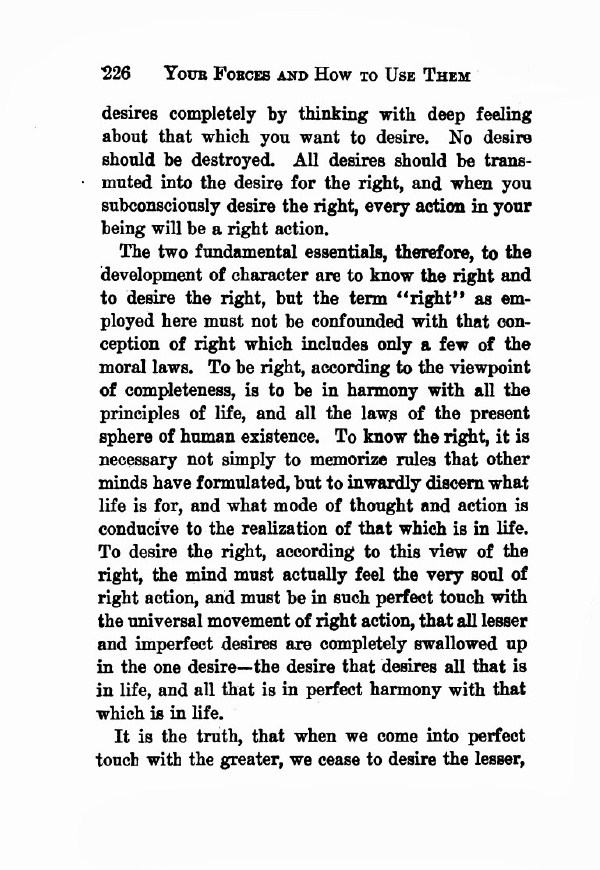 The two fundamental essentials, therefore, to the development of character are to know the right and to desire the right, but the term "right" as employed here must not be confounded with that conception of right which includes only a few of the moral laws. To be right according to the viewpoint of completeness, is to be in harmony with all the principles of life, and all the laws of the present sphere of human existence. To know the right, it is necessary not simply to memorize rules that other minds have formulated, but to inwardly discern what life is for, and what mode of thought and action is conducive to the realisation of that which is in life. To desire the right, according to this view of the right, the mind must actually feel the very soul of right action, and must be in such perfect touch with the universal movement of right action, that all lesser and imperfect desires are completely swallowed up in the one desire -- the desire that desires all that is in life, and all that is in perfect harmony with that which is in life.