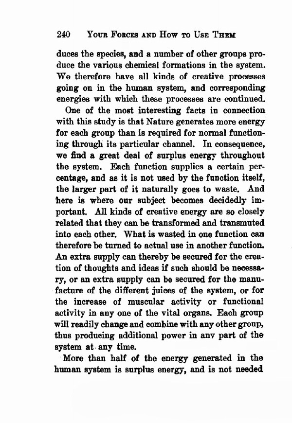 One of the most interesting facts in connection with this study is that Nature generates more energy for each group than is required for normal functioning through its particular channel. In consequence, we find a great deal of surplus energy throughout the system. Each function supplies a certain percentage, and as it is not used by the function itself, the larger part of it naturally goes to waste. And here is where our subject becomes decidedly important. All kinds of creative energy are so closely related that they can be transformed and transmuted into each other. What is wasted in one function can therefore be turned to actual use in another function. An extra supply can thereby be secured for the creation of thoughts and ideas if such should be necessary, or an extra supply can be secured for the manufacture of the different juices of the system, or for the increase of muscular activity or functional activity in any one of the vital organs. Each group will readily change and combine with any other group, thus producing additional power in any part of the system at any time.