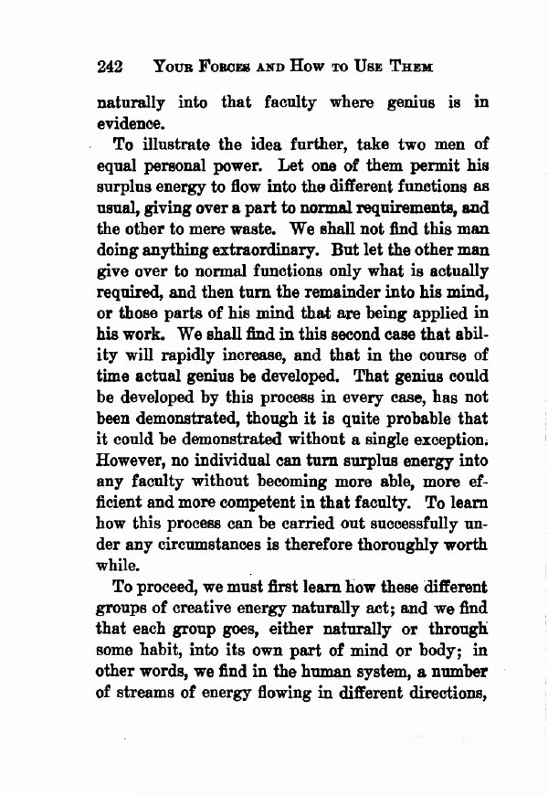 To illustrate the idea further, take two men of equal personal power. Let one of them permit his surplus energy to flow into the different functions as usual, giving over a part to normal requirements, and the other to mere waste. We shall not find this man doing anything extraordinary. But let the other man give over to normal functions only what is actually required, and then turn the remainder into his mind, or those parts of his mind that are being applied in his work. We shall find in this second case that ability will rapidly increase, and that in the course of time actual genius be developed. That genius could be developed by this process in every case, has not been demonstrated, though it is quite probable that it could be demonstrated with out a single exception. However, no individual can turn surplus energy into any faculty without becoming more able, more efficient and more competent in that faculty. To learn how this process can be carried out successfully under any circumstances is therefore thoroughly worthwhile.