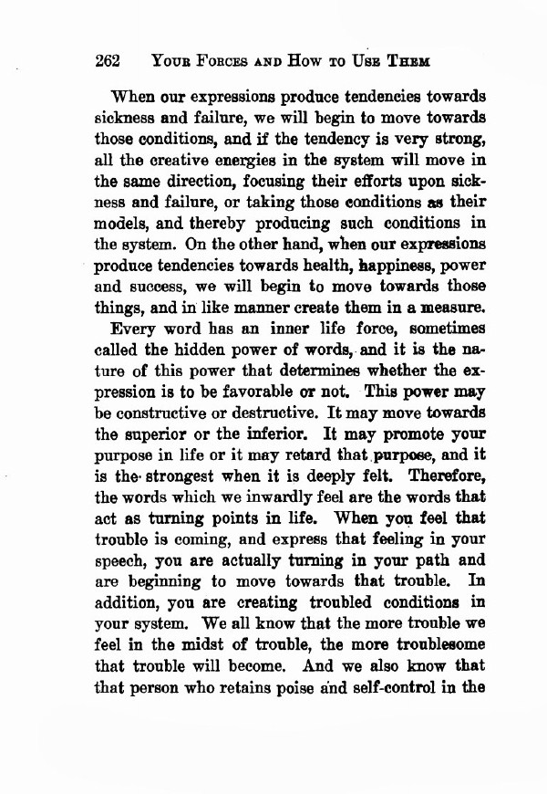 Every word has an inner life force, sometimes called the hidden power of words, and it is the nature of this power that determines whether the expression is to be favourable or not. This power may be constructive or destructive. It may move towards the superior or the inferior. It may promote your purpose in life or it may retard that purpose, and it is the strongest when it is deeply felt. Therefore the words which we inwardly feel are the words that act as turning points in life. When you feel that trouble is coming, and express that feeling in your speech, you are actually turning in your path and are beginning to move towards that trouble. In addition you are creating troubled conditions in your system. We all know that the more trouble we feel in the midst of trouble, the more troublesome that trouble will become. And we also know that that that person who retains poise and self-control in the