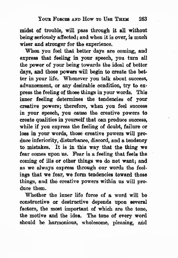 When you feel that better days are coming, and express that feeling in your speech, you turn all the power of your being towards the ideal of better days, and those powers will begin to create the better in your life. Whenever you talk about success, advancement, or any desirable condition, try to express the feeling of those things in your words. This inner feeling determines the tendencies of your creative powers; therefore, when you feel success in your speech, you cause the creative powers to create qualities in yourself that can produce success, while if you express the feeling of doubt, failure or loss in your words, those creative powers will produce inferiority, disturbance, discord, and a tendency to mistakes. It is in this way that the thing we fear comes upon us. Fear is a feeling that feels the coming of ills or other things we do not want; and as we always express through our words the feelings that we fear, we form tendencies toward those things, and the creative powers within us will produce them.