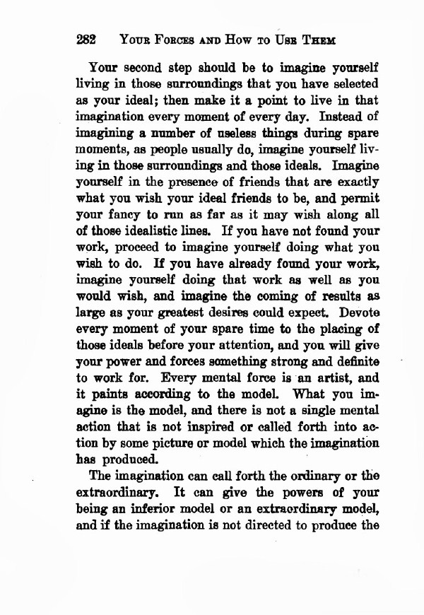 Your second step should be to imagine yourself living in those surroundings that you have selected as your ideal; then make it a point to live in that imagination every moment of every day. Instead of imagining a number of useless things during spare moments, as people usually do, imagine yourself living in those surroundings and those ideals. Imagine yourself in the presence of friends that are exactly what you wish your ideal friends to be, and permit your fancy to run as far as it may wish along all of those idealistic lines. If you have not found your work, proceed to imagine yourself doing what you wish to do. If you have already found your work, imagine yourself doing that work as well as you would wish, and imagine the coming of results as large as your greatest desires could expect. Devote every moment of your spare time to the placing of those ideals before your attention, and you will give your power and forces something strong and definite to work for. Every mental force is an artist, and it paints according to the model. What you imagine is the model, and there is not a single mental action that is not inspired or called forth into action by some picture or model which the imagination has produced.