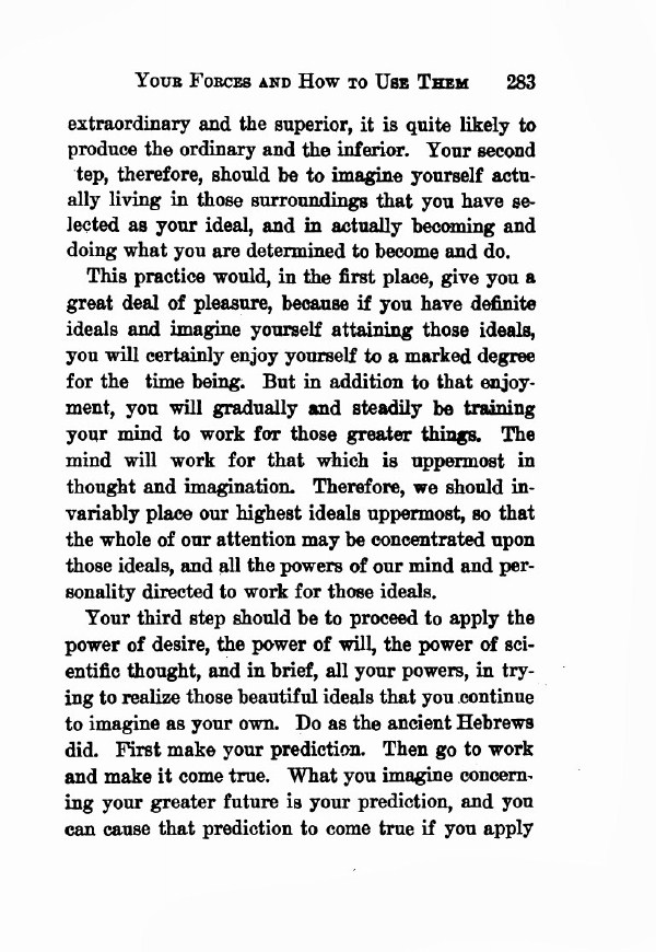 Your third step should be to proceed to apply the power of desire, the power of will, the power of scientific thought, and in brief, all your powers, in trying to realize those beautiful ideals that you continue to imagine as your own. Do as the ancient Hebrews did. First make your prediction. Then go to work and make it come true. What you imagine concerning your greater future is your prediction, and you can cause that prediction to come true if you apply