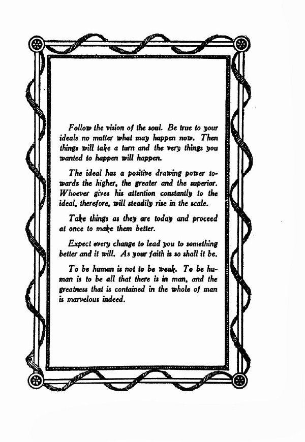 Contents - Foreword - Ruling Principle of Man - How We Govern The Forces We Possess - Use of Mind In Practical Action - Forces of The Subconscious - Training the Subconscious for Practical Results - Power of Subjective Thought - How Man Becomes What He Thinks - Art of Changing For The Better - He Can Who Thinks He Can - How We Secure What We Persistently Desire - Concentration And The Power Back of the Suggestion - Development of the Will - Building of a Great Mind - How Character Determines Constructive Action - Art of Building Character - Creative Forces in Man - Building Power of Constructive Speech - Imagination and the Master Mind - Higher Forces in Man - Greatest Power in Man -