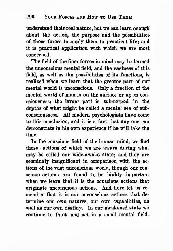 The field of the finer forces in mind may be termed the unconscious mental field, and the vastness of this field, as well as the possibilities of its functions, is realized when we learn that the greater part of our mental world is unconscious. Only a fraction of the mental world of man is on the surface or up in consciousness; the larger part is submerged in the depths of what might be called a mental sea of subconsciousness. All modern psychologists have come to this conclusion, and it is a fact that anyone can demonstrate in his own experience if he will take the time.